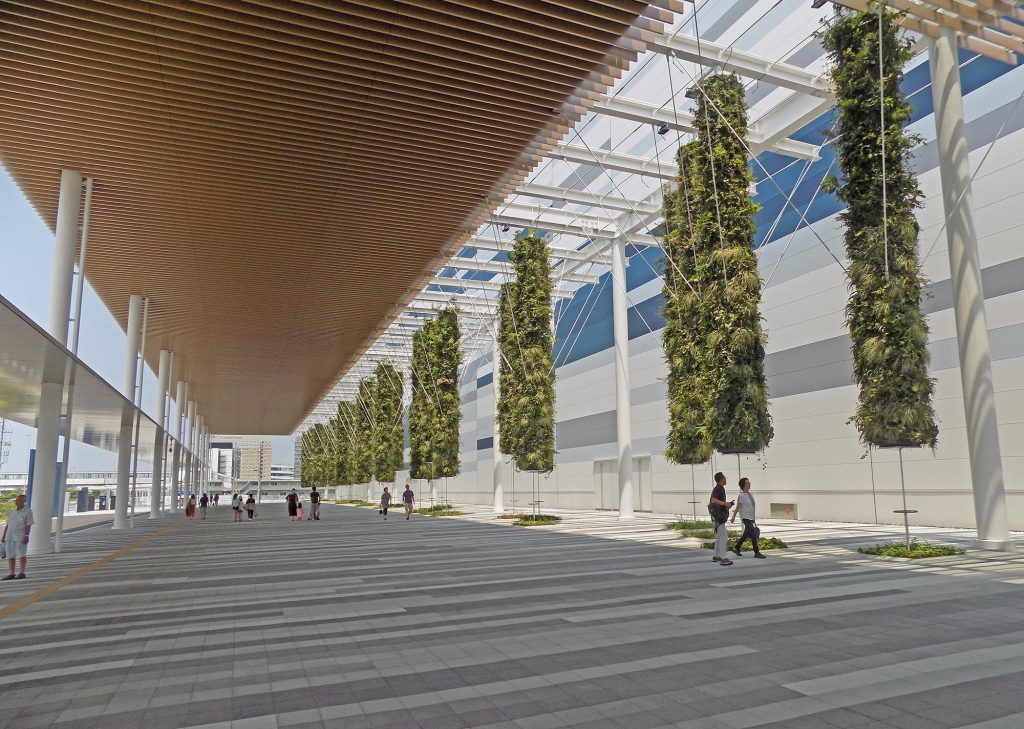 会場のエントランス前は明るく開放的で緑の柱が印象的です。