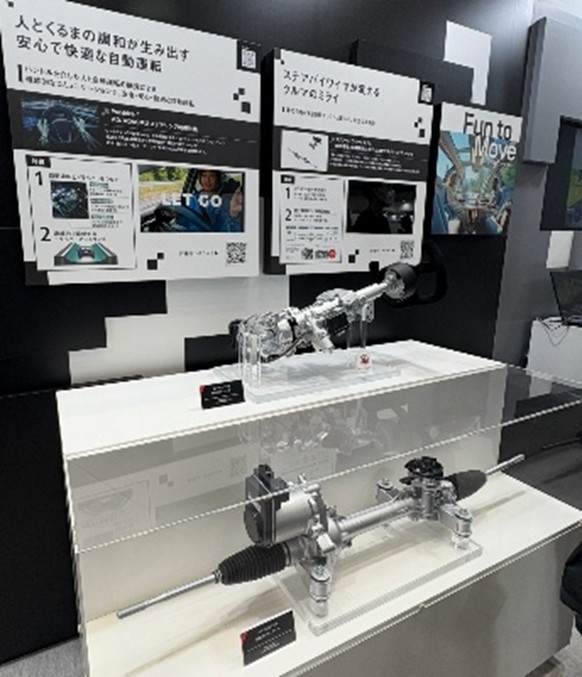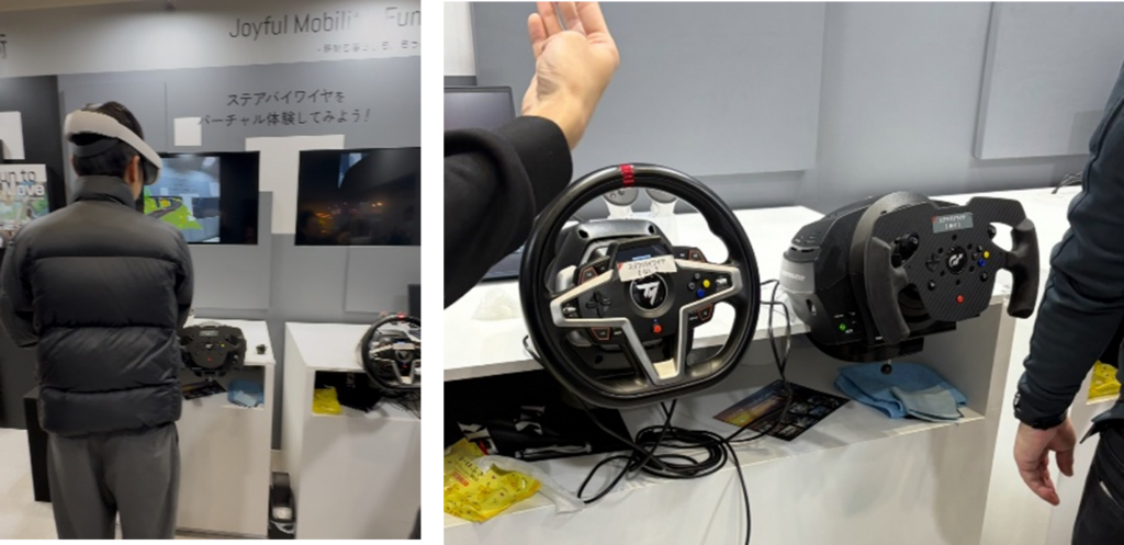 ブース横に列ができていたため見てみると、「ステアバイワイヤをバーチャル体験してみよう」という展示が行われていました。そこで実際に並んで体験してきました。