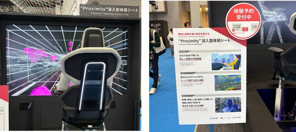 ブース正面にて注目を集めていたのは「Proximity没入体験シート」。映像と音に連動してシートが振動・可動し、全身で感じる4D体験ができるというものです。