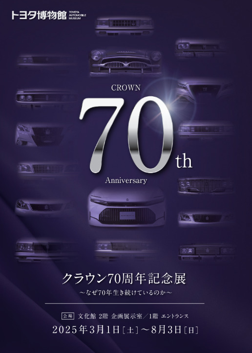 トヨタ博物館 文化館2階 企画展示室にて、国産最長寿の乗用車として16代にわたり続いている「クラウン」の70周年記念企画展が開催。