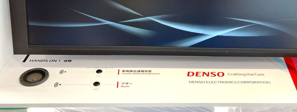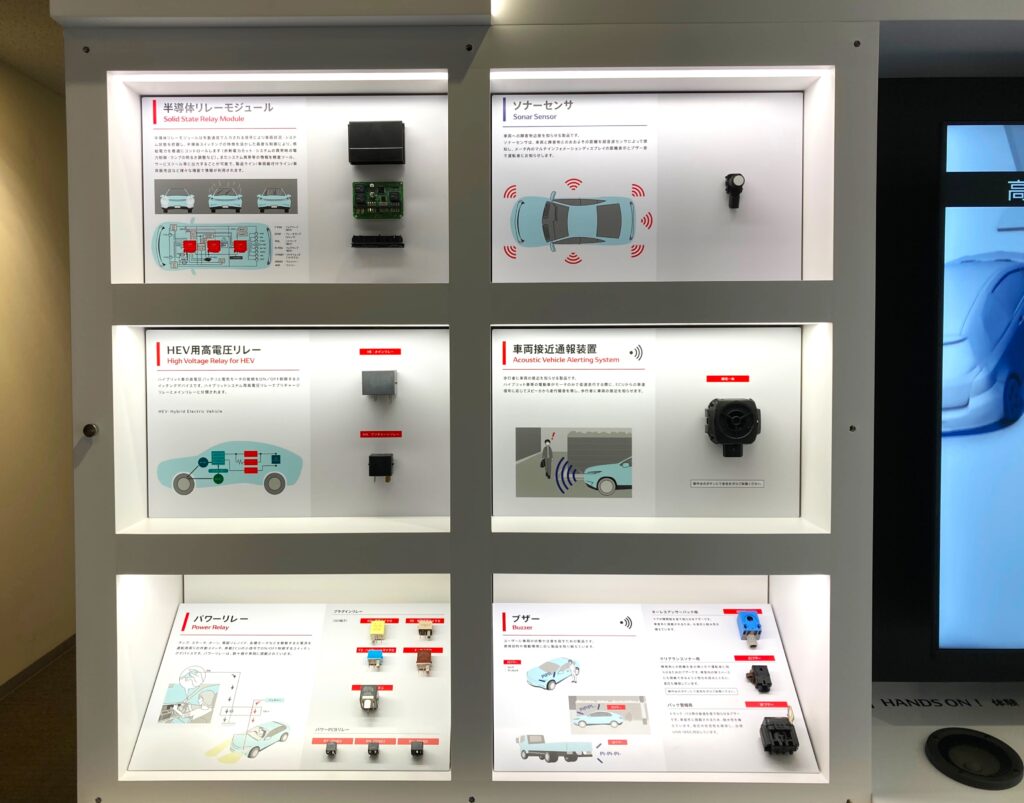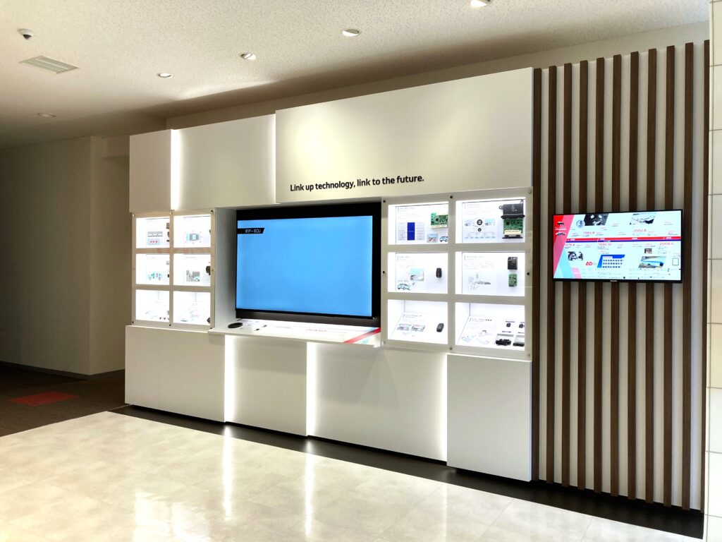 製品の理解と製品の将来性を紹介できる場として、情報をしっかりと伝え、製品の魅力を引き出せるよう配慮。製品の展⽰が象徴的なオブジェとなるように凹凸面を採用し、間接照明を効果的に使い迫⼒ある造形としました。また、製品の入れ替えがしやすいように としています。65インチモニターでは製品紹介映像、モニター手前では、車両接近音やブザーの製品の音を再生することができます。