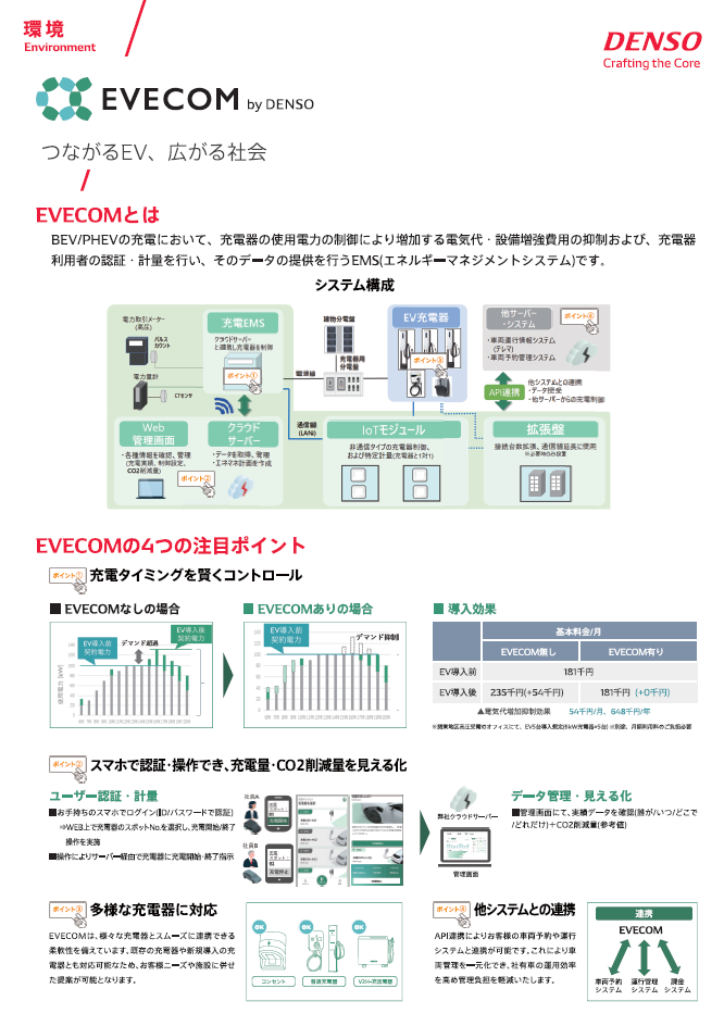 EV充電管理の軽減や電力基本料金の抑制により、EV社会の普及を支える「EVECOM」のカタログとパネルの制作をお手伝いさせて頂きました。